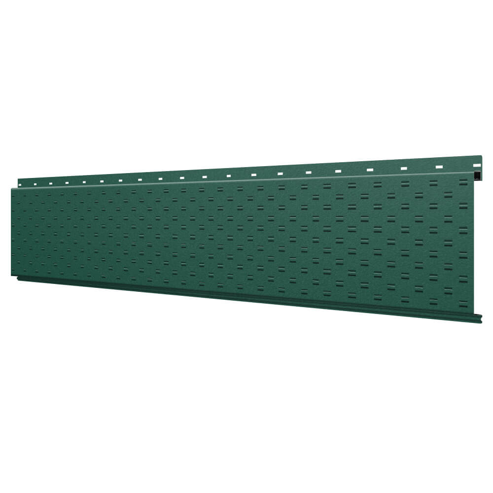 Линеарная потолочно-стеновая панель с ПЕРФОРАЦИЕЙ для вентиляции цвет RAL6005 Зеленый Мох Стальной Бархат применяется в качестве софитов для подшивы крыши, наружной и внутренней отделки потолков, стен, фронтонов фасада дома в Ханты-Мансийске.