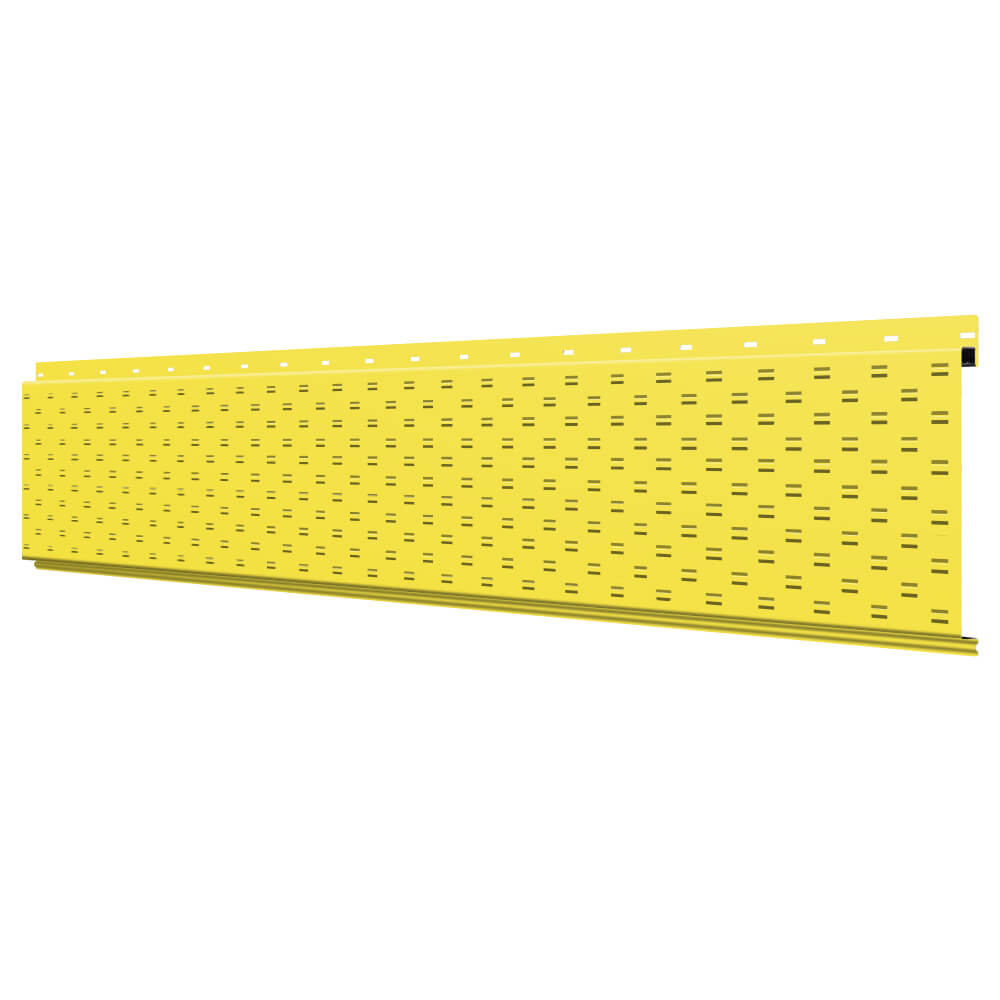 Линеарная потолочно-стеновая панель с ПЕРФОРАЦИЕЙ для вентиляции цвет RAL1018 Желтый применяется в качестве софитов для подшивы крыши, наружной и внутренней отделки потолков, стен, фронтонов фасада дома в Ханты-Мансийске.